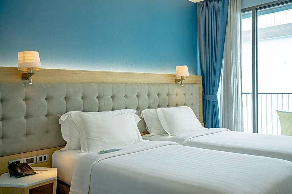 The twin/double room offers a balcony and a private bathroom with a separate bathtub and shower.