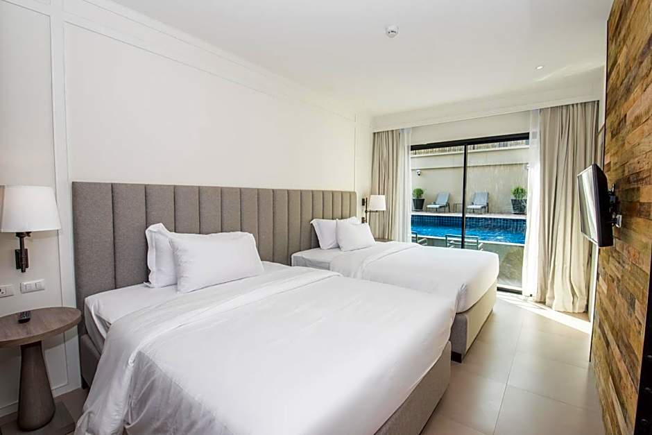 DELUXE POOL ACCESS is 377 square feet and includes either 2 single beds 80-130 width or a queen-size bed 150-154 width plus balcony, hairdryer, safe, and bathrobes.