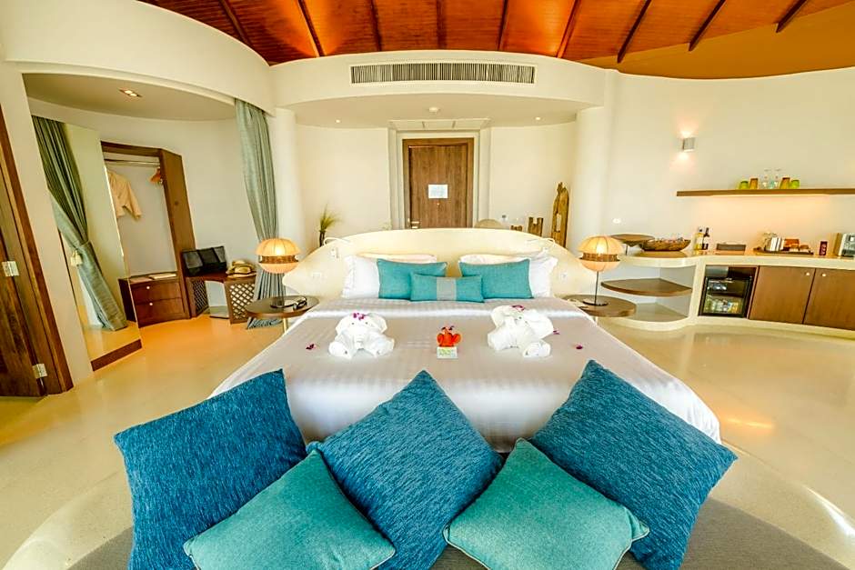 This luxury villa features a private pool, a furnished wooden deck and an outdoor rain shower. At the front of the villa, there is an additional sitting area to relax and enjoy garden views and the tropical ambiance. The unique interior of the villa includes shapely curves and a boat-inspired ceiling.