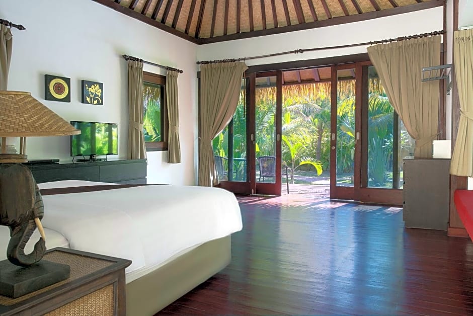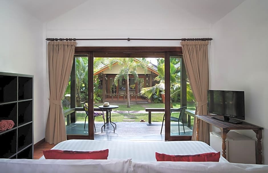 This bungalow has a balcony with garden view, patio and clothes dryer. It also comes with an open-air bathroom with dual porcelain sinks and rain shower.