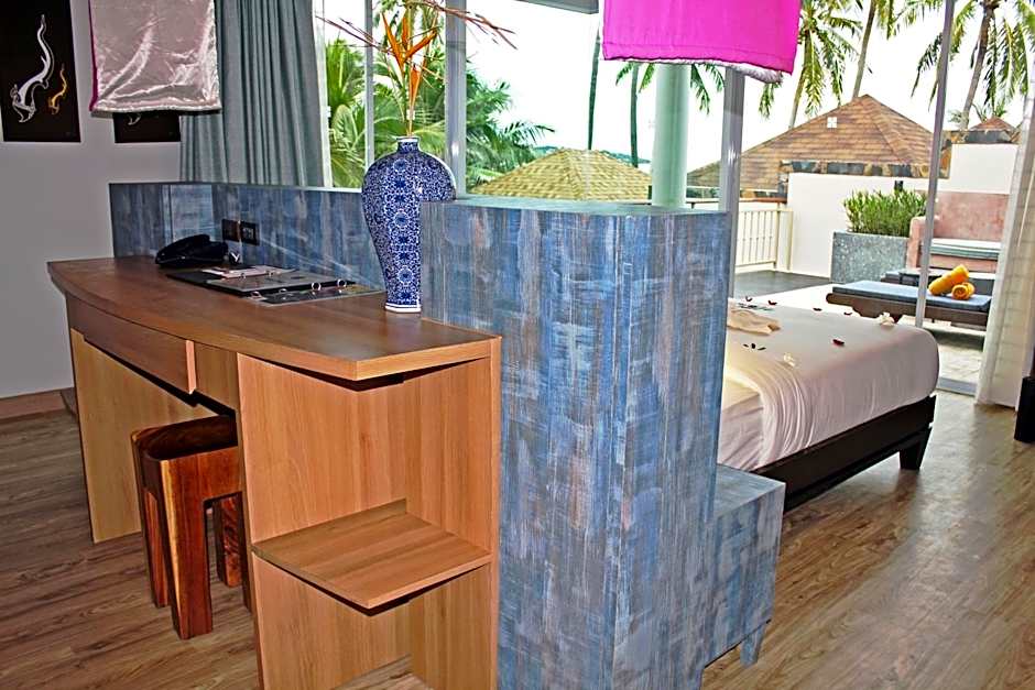 Penthouse overlooks Lamai Beach. Offers a separate living and dining room, kitchen, and outdoor spa bath.