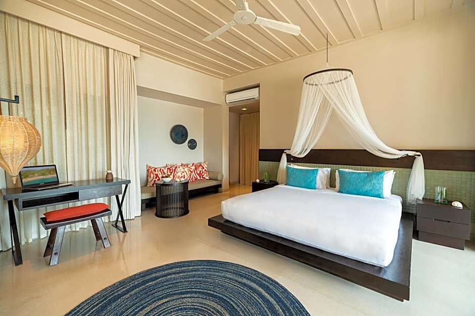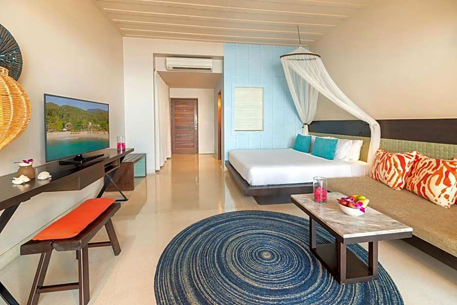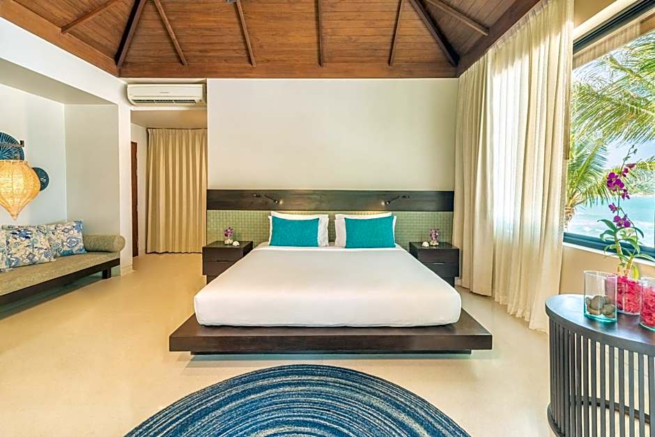 The beachfront room offers both indoor and outdoor living space and features direct beach access and views of the sea.