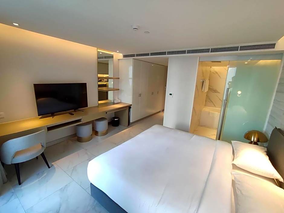 Welcome to our Deluxe Studio, a spacious and modern studio room perfect for 2 adults and 1 child. Equipped with a king size bed, private bathroom with bathtub, and stunning views, our room offers a comfortable and luxurious stay. Enjoy the convenience of a washing machine, microwave, and flat-screen TV, and relax in the comfort of air conditioning. Perfect for a city getaway or a longer stay, our Deluxe Studio has everything you need for a memorable experience.