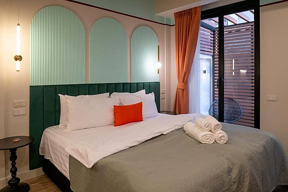 The accommodation lineup spans studios, superior rooms, deluxe rooms, suites, and apartments, providing flexible options for solo travelers, couples, or small groups. Examples include Studio and Superior Room configurations, as well as Deluxe Rooms and two-bedroom Apartments with terraces or courtyard views. Many spaces feature handy extras such as kitchenware or kitchenette setups, bathtubs, free toiletries, and a bidet, with non-smoking rooms available for comfort.