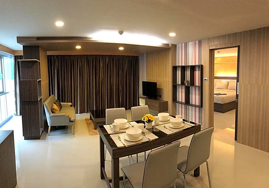 The room is so spacious for 3 people. Complete with kitchen and living room. We stayed for a night just for a concert at Rajamangala Stadium. You can easily walk 2km to the stadium which is quite okay. 7eleven just next to the hotel and a nice coffee shop and big C mini in the same neighborhood.