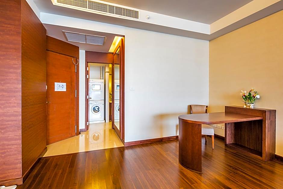 TWO BEDROOM EXECUTIVE is 1270 square feet and includes a king-size bed 150-183 width plus balcony, desk, hairdryer, ironing set, bathrobes, and slippers.