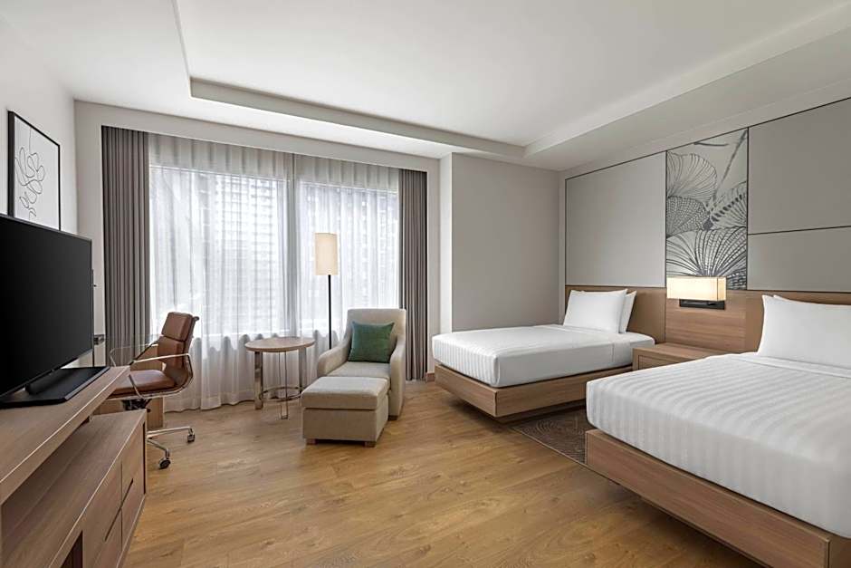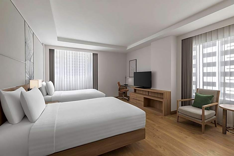 The Courtyard by Marriott Bangkok offers a variety of room types including renovated grand double rooms with two double beds, renovated deluxe twin rooms, renovated deluxe king rooms with city views on the high floor, renovated grand king rooms, renovated family rooms with city views, and renovated deluxe king rooms with city views. All rooms do not allow smoking and vary in occupancy, ranging from 2 adults and 1 child to 4 adults and 1 child. The bed sizes include double beds, twin beds, and king-size beds. Room sizes range from 323 sqft to 484 sqft.
