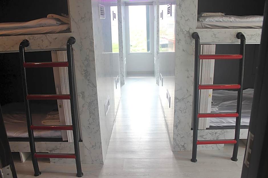 Capsule beds in a hotel-like atmosphere. New, clean, pool, rooftop terrace. Lots of showers and toilets. Big storage for bags/valuables and lockable bed.