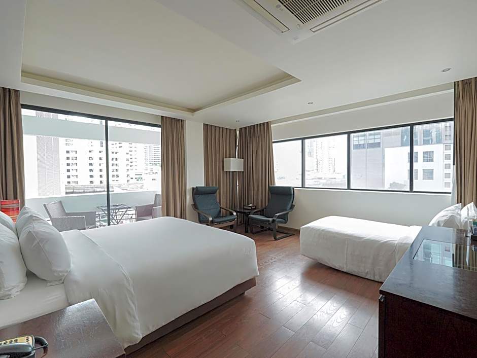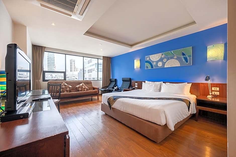 The Hotel Mermaid Bangkok offers a variety of room types including suites and double rooms. The rooms range in size from 258 sqft to 700 sqft. Smoking is not allowed in any of the rooms. All rooms have a capacity of accommodating 2 adults and 1 child. The bed sizes vary and include Queen and King size beds.