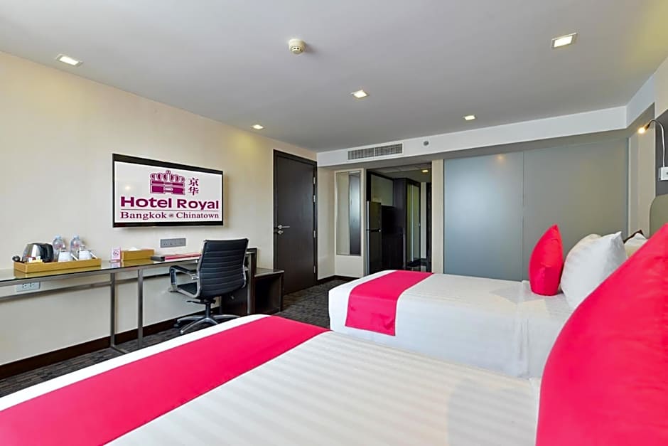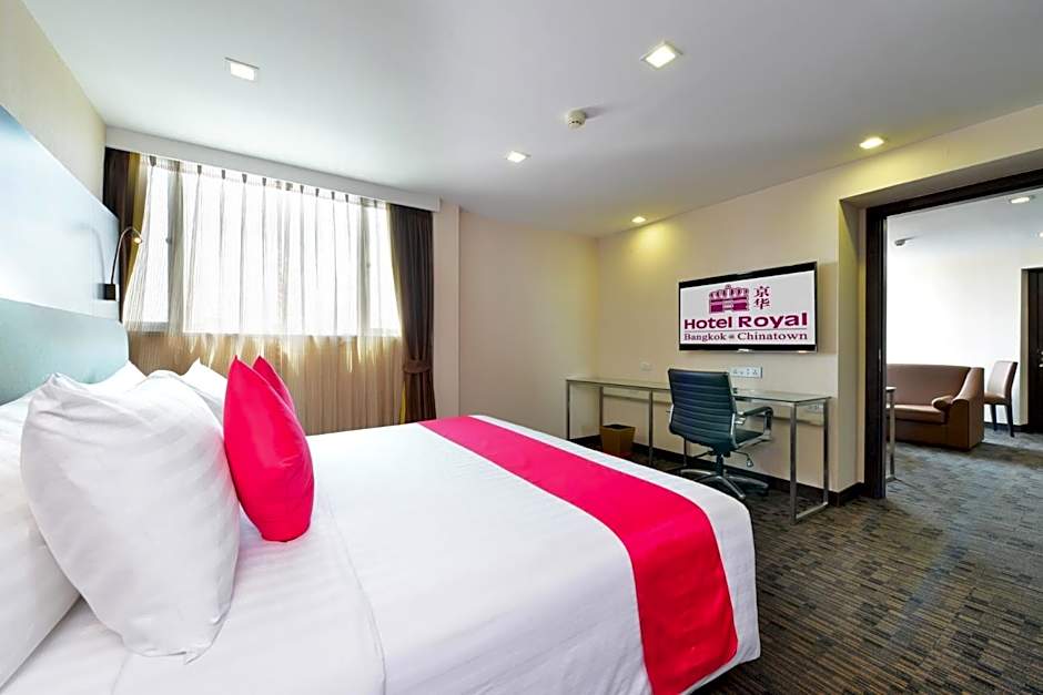 The Hotel Royal Bangkok@Chinatown offers a variety of room types including Deluxe Triple, Premium Deluxe Twin with Bathtub, Superior Double or Twin with no window, One-Bedroom Apartment, Premium Deluxe, Family Room, and Deluxe Double or Twin. Smoking is not allowed in any of the rooms. The rooms accommodate varying numbers of adults and children, with bed options including twin, double, queen size, and sofa bed. Room sizes range from 301 sqft to 646 sqft.