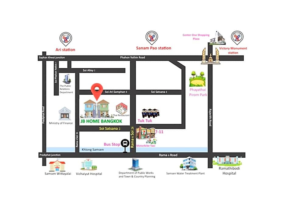 Located in Bangkok's Victory Monument area, JB Home Bangkok - Victory Monument is a two-star stay about from the city center, at 43 Soi Satsana 2, Phaya Thai. The listing features an adults-only policy, free Wifi, air conditioning, a private entrance, a terrace, non-smoking rooms, free toiletries, and a balcony.