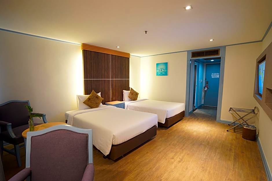 Room options span a range from Deluxe and Deluxe Corner to Executive Suites and Jacuzzi Suite, with configurations including Twin and King beds. The property sits about 10,5mi from Bangkok's city center, offering a quieter base while staying close to the capital's sights.