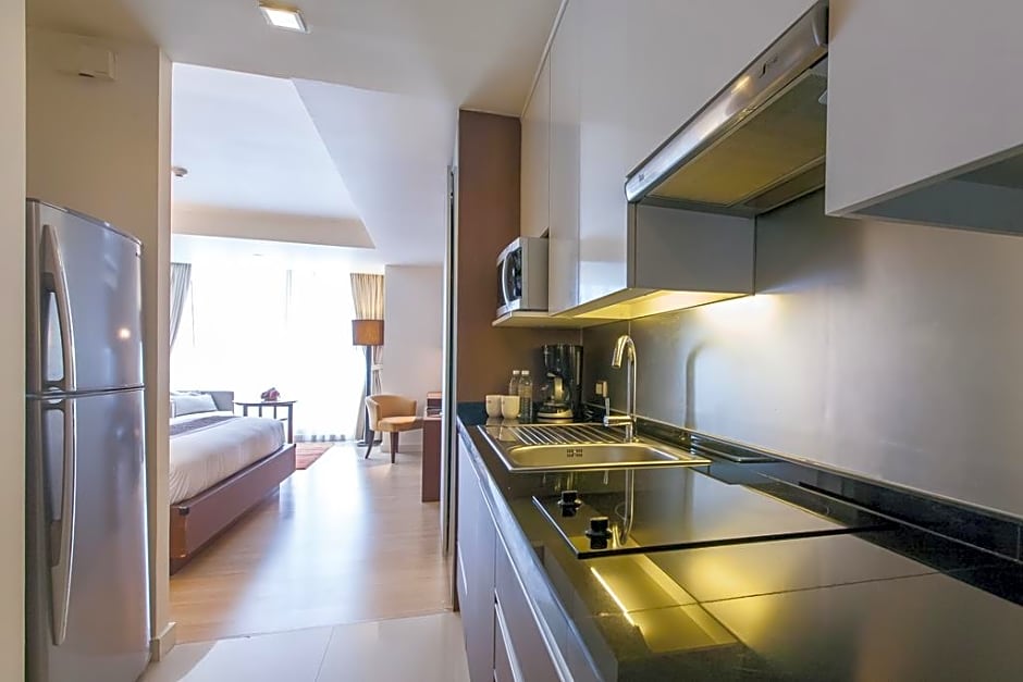 The 1-bedroom suites feature a combined living and dining area with a large open kitchen and a separate bedroom. The bedroom offers a king-sized bed, a work desk and a wardrobe. It has a walk-in rain shower and is also fitted with a washer-dryer. Some units include a separate bathtub. The living room has a sofa, arm chairs, a coffee table and a TV. Kitchen amenities include a stovetop, microwave, kitchenware and other necessities.