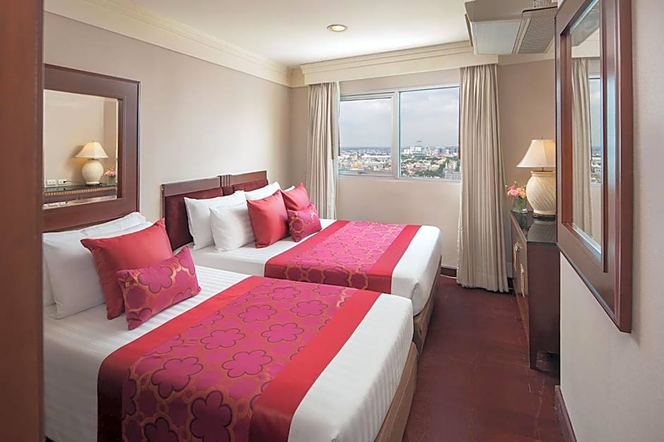 The Prince Palace Hotel Bangkok offers a variety of rooms including Standard Twin Rooms, Superior Twin Rooms, Deluxe Rooms, Three-Bedroom Suites (Family Rooms), Executive Suites, One-Bedroom Suites, and Two-Bedroom Suites (Family Rooms). Smoking is not allowed in any of the rooms. The room sizes range from 366 sqft to 1033 sqft. Bed sizes include Twin beds, Queen size beds, King size beds, and some suites also have sofa beds. The rooms can accommodate either 2 or 4 adults, and the Family Rooms can accommodate up to 6 adults.