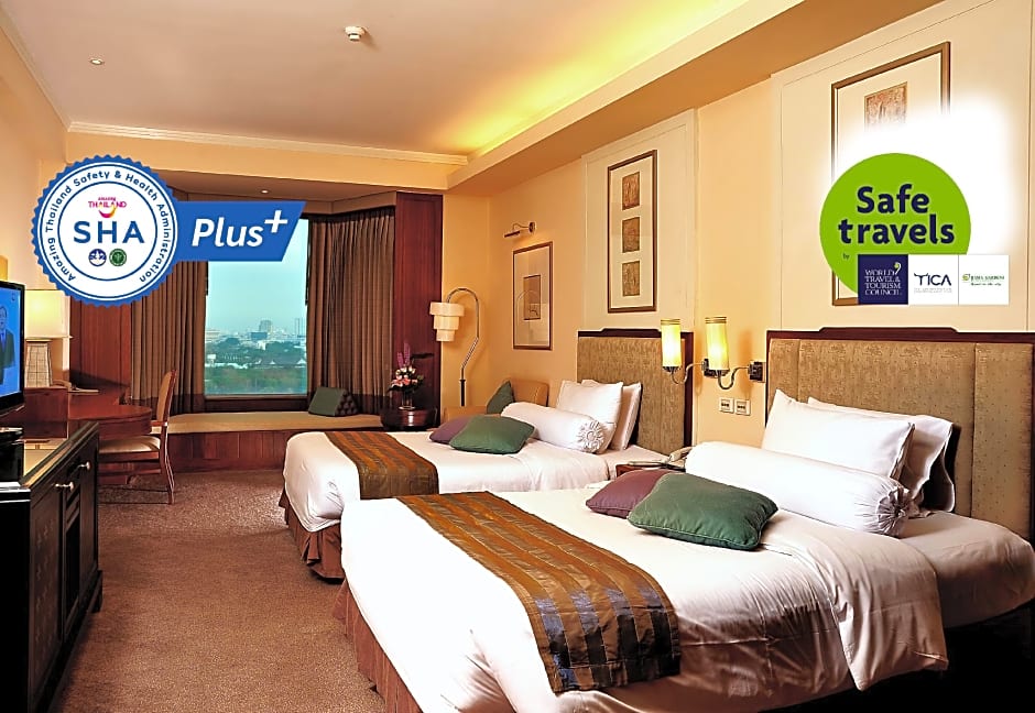 The Rama Gardens Hotel Bangkok offers a variety of room types, including suites and double or twin rooms. The suite options include the Presidential Suite, Executive Suite, and Junior Suite, with sizes ranging from 646 to 1033 sqft. All rooms do not allow smoking and can accommodate 2 adults and 1 child. The bed sizes vary, with options such as queen, twin, and king size beds available.