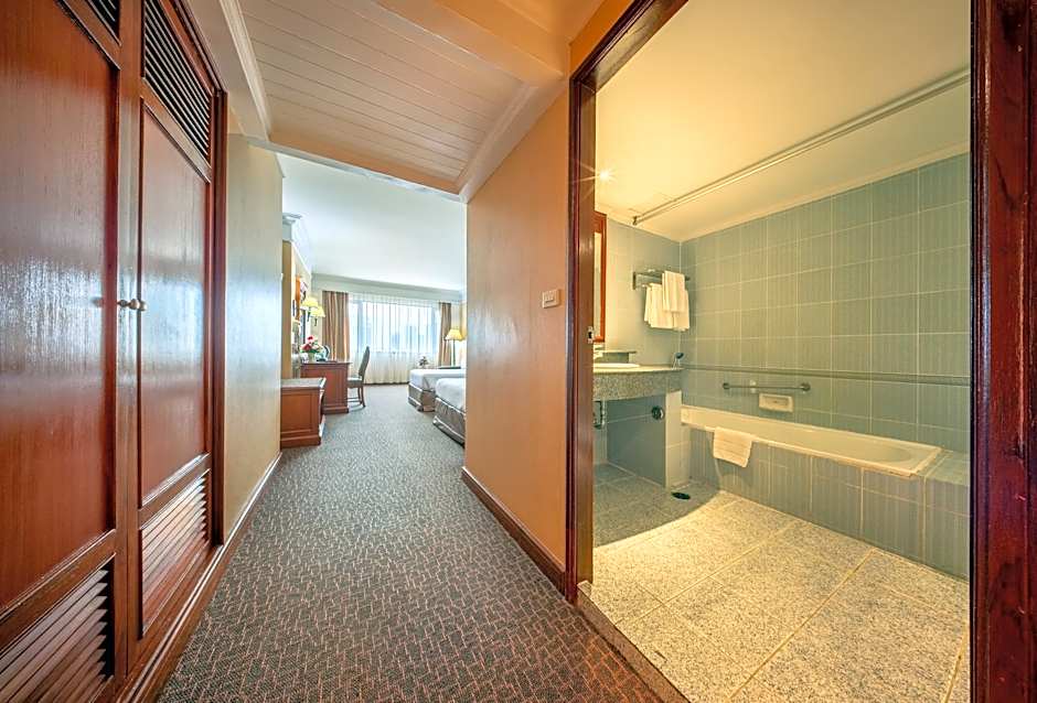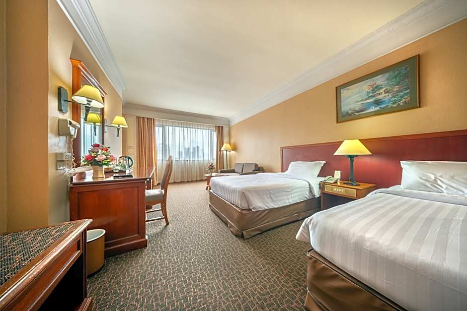 The Royal Benja Hotel offers two types of rooms: the Grand Deluxe Double or Twin Room and the Deluxe Double or Twin Room. Both room types have a size of 495 sqft and do not allow smoking. They can accommodate a maximum of 3 adults and 1 child, and are equipped with either two twin beds or one queen size bed.