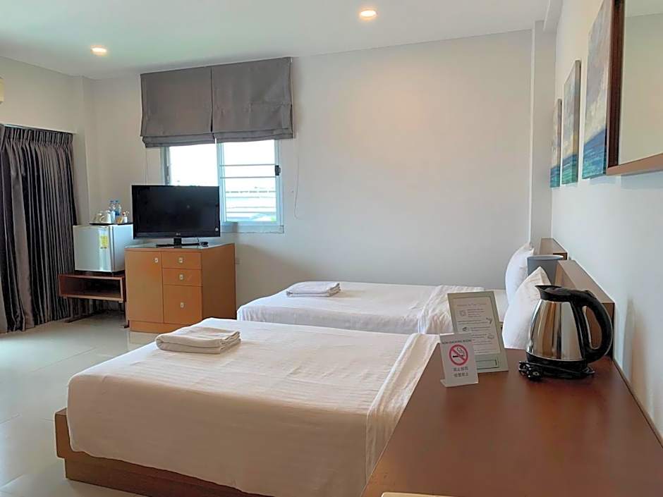 The rooms were very clean and spacious. All advertised amenities were present. Bathroom large and toiletries provided. Shower was hot. Towel changes daily. Air con quiet, bed very big and comfortable. Lifts available. Balcony. Location is just off busy road, but very quiet. 7 Eleven 2 mins walk away. Cooked food market less than 10 walk mins away. Lat Krabang Airport rail station a few mins drive and 50baht in taxi. International Airport less than 100baht in taxi (hotel can call you a metered taxi). Would recommend this hotel.