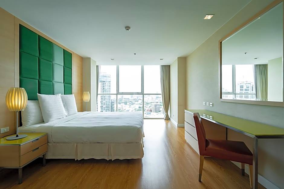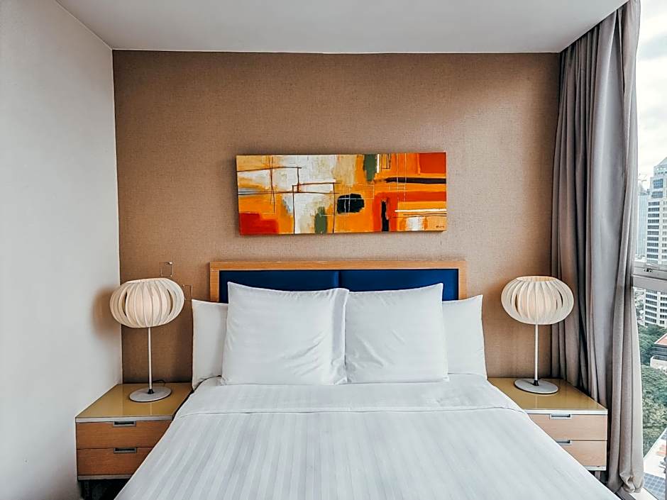 The Urbana Langsuan Hotel offers Studio rooms with a balcony, One-Bedroom Apartments, Two-Bedroom Apartments, and Premier Two-Bedroom Apartments. All rooms are non-smoking and range in size from 484 sqft to 1830 sqft. The Studio and One-Bedroom Apartments accommodate 2 adults and 1 child, while the larger apartments accommodate 4 adults and 1 child, or 6 adults and 1 child. Bed sizes vary between rooms, with options including King size, Queen size, and Twin beds.