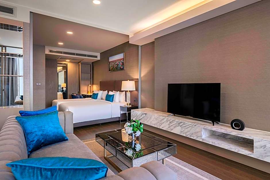 The Wyndham Bangkok Queen Convention Centre offers a variety of rooms including the Two Bedroom Suite, Deluxe Twin, and Standard King. The Two Bedroom Suite is a spacious suite with 829 sqft of space and can accommodate 4 adults. Smoking is not allowed in any of the rooms. The Deluxe Twin room is smaller at 624 sqft and is suitable for 2 adults with 2 twin beds. The Standard King room is the smallest at 377 sqft and has a king-size bed for 2 adults.