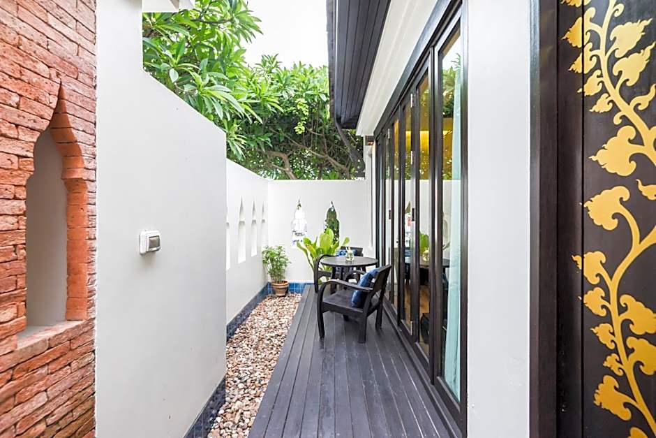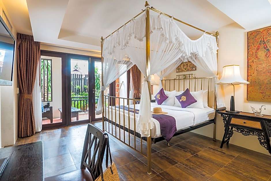 This Thai-style room features a private balcony and an private bathroom with a bathtub.