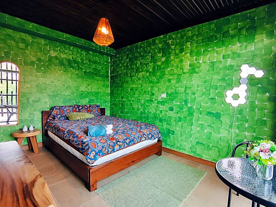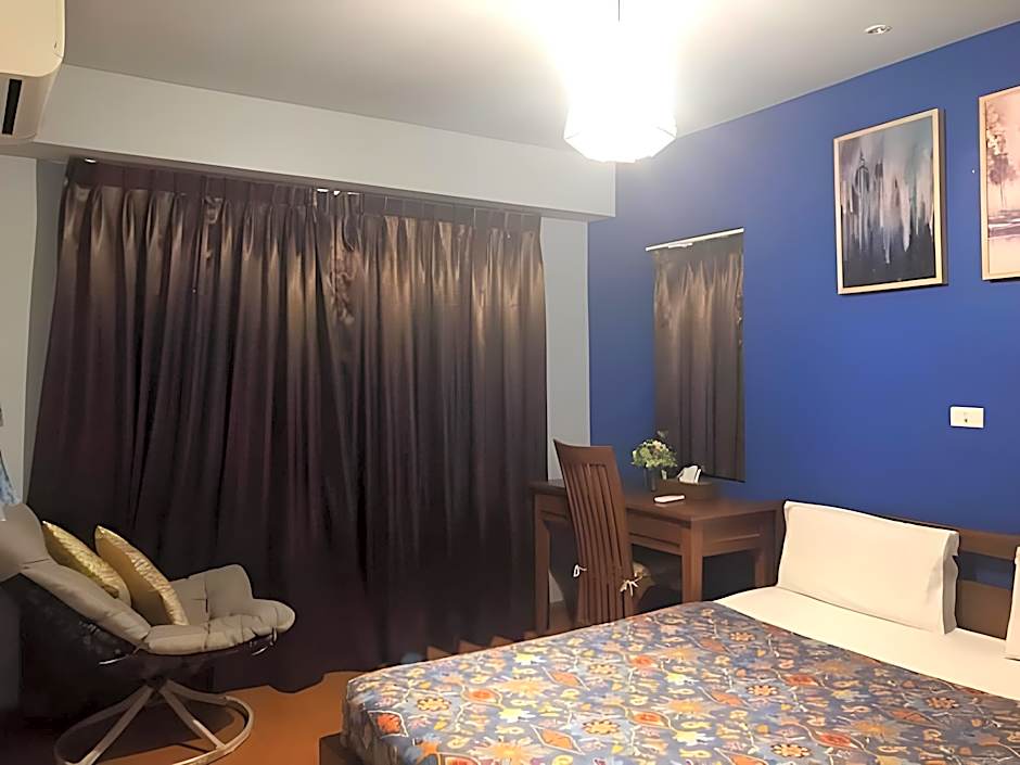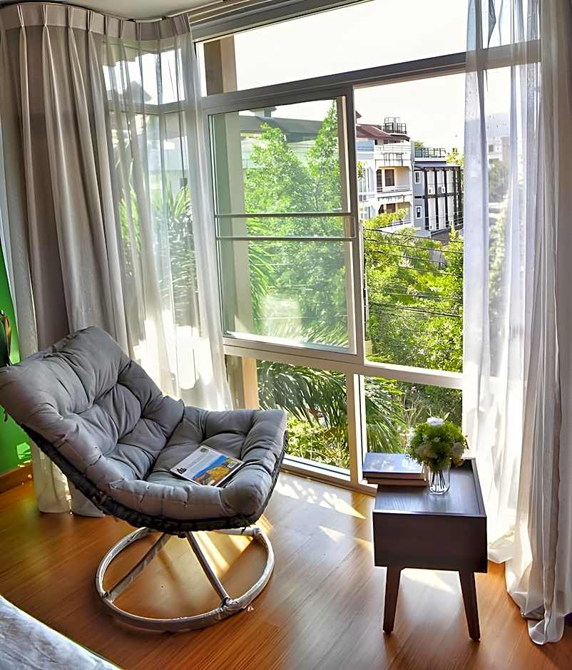 Pretty room, I liked the color and enjoyed the setup. It was a simple room but the desk and papasan made it feel bigger somewhat. I liked the free coffee available, and it's located in a nice area. Just close enough to the Nimman area to walk, but distant enough to feel like it's away from the busy crowds. There are lovely coffee shops and restaurants in the neigborhood as well. The free bottles of water were a thoughtful touch. Cute dogs downstairs too.