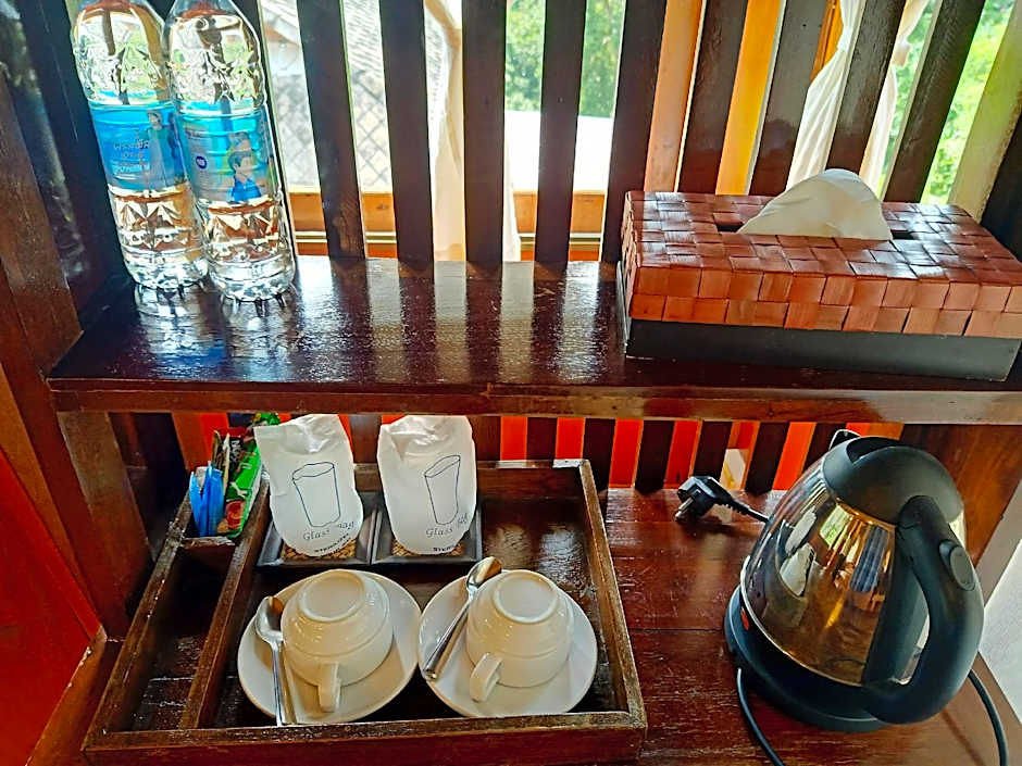 Everything thoughtful: bottled water, tea kit, comfy mattress, and serene mountain air.