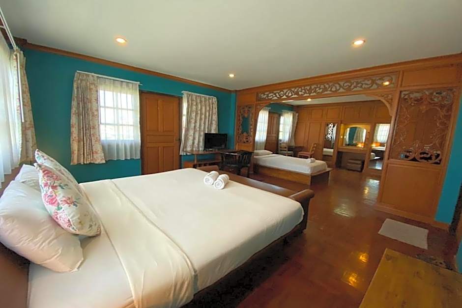 Rooms available at Norn-Nanta House include King Rooms with Mountain View, Quadruple Rooms with Shared Bathroom, Double Rooms with Balcony, Deluxe Family Rooms, and Twin Rooms with Balcony. These rooms vary in occupancy, with some accommodating two adults and one child, and others accommodating up to four adults and one child. Smoking is not allowed in any of the rooms. Bed sizes range from queen to twin, with some rooms offering a combination of bed sizes.