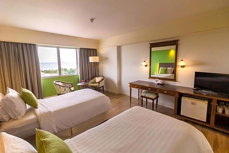 The Hua Hin Grand Hotel and Plaza offers a variety of rooms including Superior Double or Twin Rooms, Family Two-Bedroom Suites, Deluxe Double or Twin Rooms, and One-Bedroom Suites. Smoking is not allowed in any of the rooms. The rooms can accommodate 2 adults and 1 child, except for the Family Two-Bedroom Suite which can accommodate 4 adults and 2 children. The bed sizes range from Queen size bed to Twin beds. The room sizes vary from 323 sqft to 969 sqft.