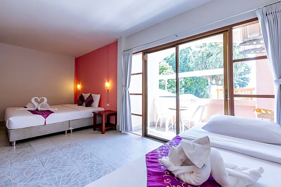 Room options span several configurations, including Budget; Budget, 2 Twin; Deluxe, 2 Twin, Balcony; Superior, Balcony; Triple Room, Balcony; Quadruple Room, Balcony; Superior Double Room; Room - 2 Bed; Deluxe, Balcony; Deluxe, 1 Bedroom; Family; Room, Balcony. Some accommodations fit 2 adults and 1 children, while others accommodate up to 4 adults and 1 children, with various bed arrangements. These choices offer simple, value-focused stays near Hua Hin’s beach and town conveniences.