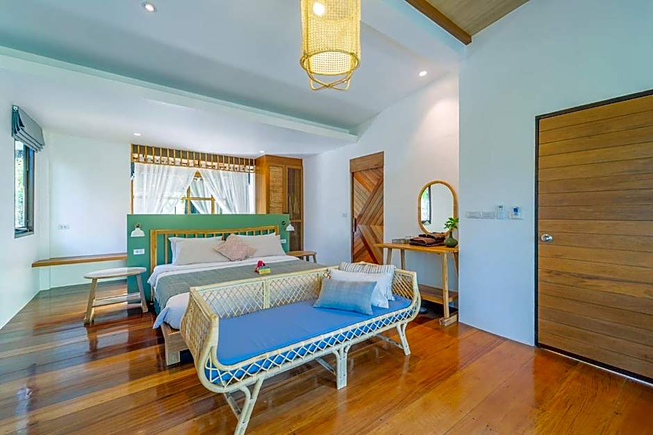 Located on the 2nd floor, the double room features wooden flooring and a front and back balcony with panoramic garden and pool views.