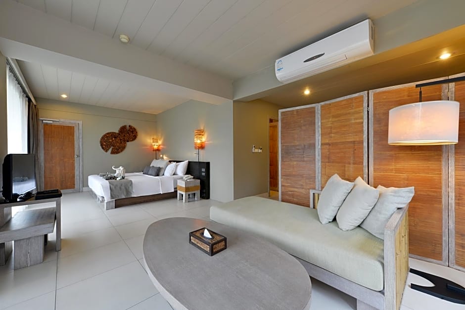 Located nearer the beachfront in the villa section of the resort, this detached villa comes with its over outdoor covered seating area and features natural bamboo materials accented by soothing earth tones. Shower facilities are included in a private bathroom.