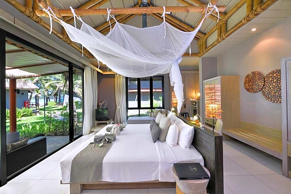 Located directly in front of the beachfront and just steps from the sea, this detached villa comes with its own outdoor covered seating area and features natural bamboo materials accented by soothing earth tones. Offers a cable flat-screen TV and tea/coffee making facilities. Private bathroom comes with shower facilities.