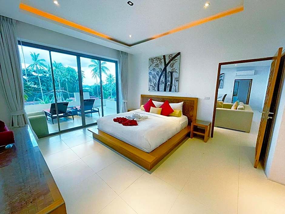 This spacious contemporary-designed space includes a balcony with a private infinity edge pool and separate sun deck. It has a spacious living room, fully-equipped kitchen with modern appliances and a dining area. Guests enjoy sweeping views of the picturesque Lamai Bay.