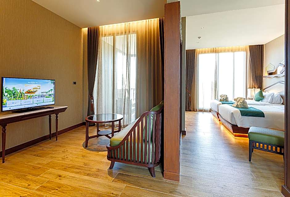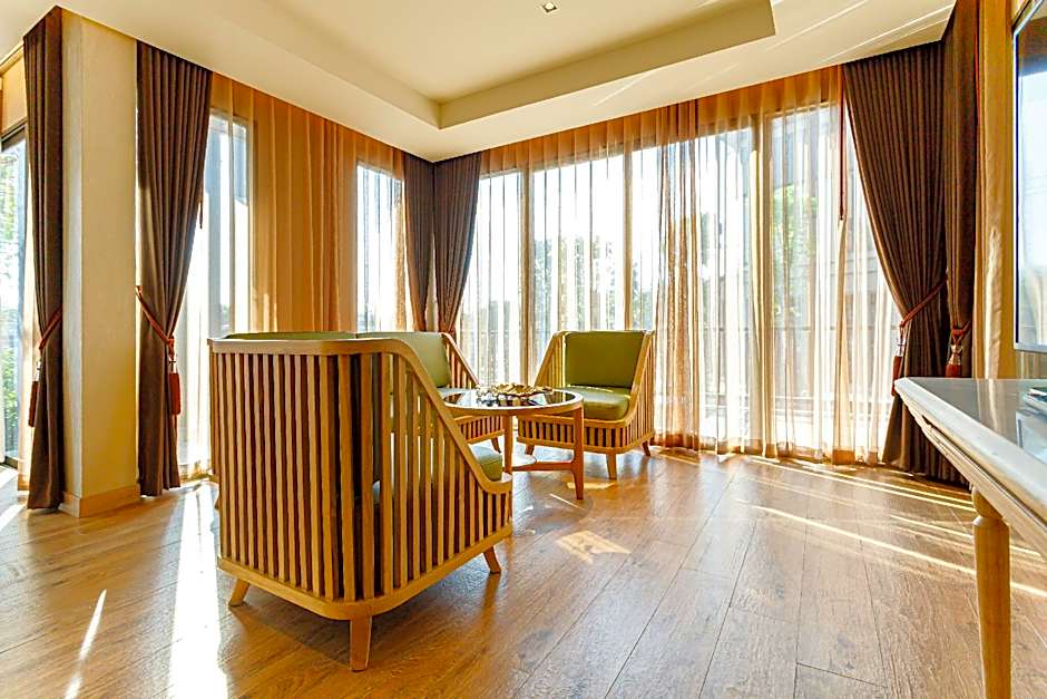 The hotel offers a variety of rooms including Executive Suites, Suites with Spa Bath, Deluxe Studios, Studios with Garden View, Villas, and Suites with Private Pool. All rooms are non-smoking and can accommodate 2 adults and 1 child. The bed sizes range from King size, Twin bed, Queen size, to Sofa Bed. The room sizes vary from 312 sqft to 1055 sqft.