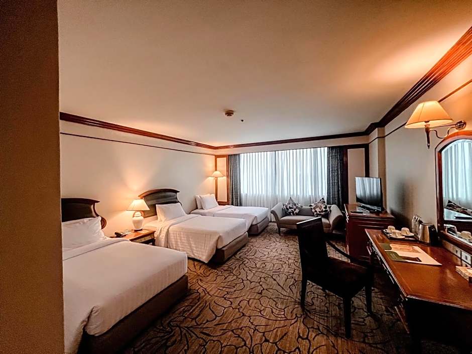 The Twin Lotus Hotel offers various types of rooms including Superior Twin, Deluxe Double, Deluxe Twin, Family Junior Suite, Executive Suite, and Superior Double. All rooms are non-smoking and have a size of 344 sqft, except the Family Junior Suite with 614 sqft and the Executive Suite with 958 sqft. The rooms can accommodate 2 adults and 1 child, with bed options including twin beds, king size beds, and a queen size bed.
