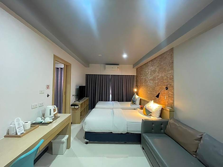 The Bangkok Boutique Resort Rangsit offers two types of rooms. The Large Twin Room is a spacious 377 sqft room with two twin beds and can accommodate 2 adults and 1 child. Smoking is not allowed in this room. The Deluxe King Room is the same size and can also accommodate 2 adults and 1 child, featuring a king size bed and no smoking is allowed.