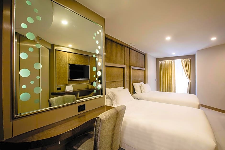 DELUXE CITY VIEW TWIN is 280 square feet and includes 2 single beds 80-130 width.