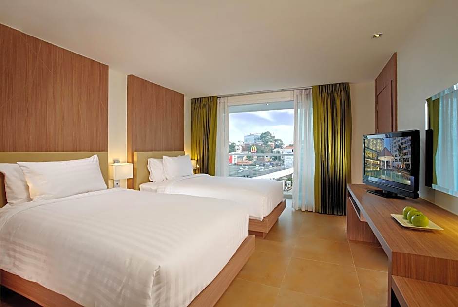 The Centara Pattaya Hotel offers a variety of room types including Deluxe rooms with twin beds, Family Studio rooms with a king bed and bunk bed, 2 Bedroom rooms with either 2 queen beds or a king bed and 2 single beds, and a 1 Bedroom Suite with a king bed and sofa bed. All rooms are non-smoking and have different occupancy capacities ranging from single to quadruple. The room sizes range from 312 sqft to 646 sqft.