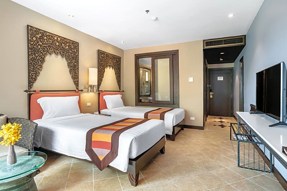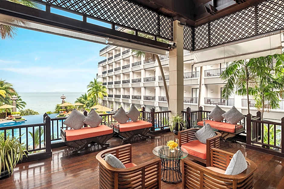 The hotel has an on-site restaurant called Chom Talay offering a modern ambiance and serving American, Pizza, Thai, Asian, and International cuisines exclusively.