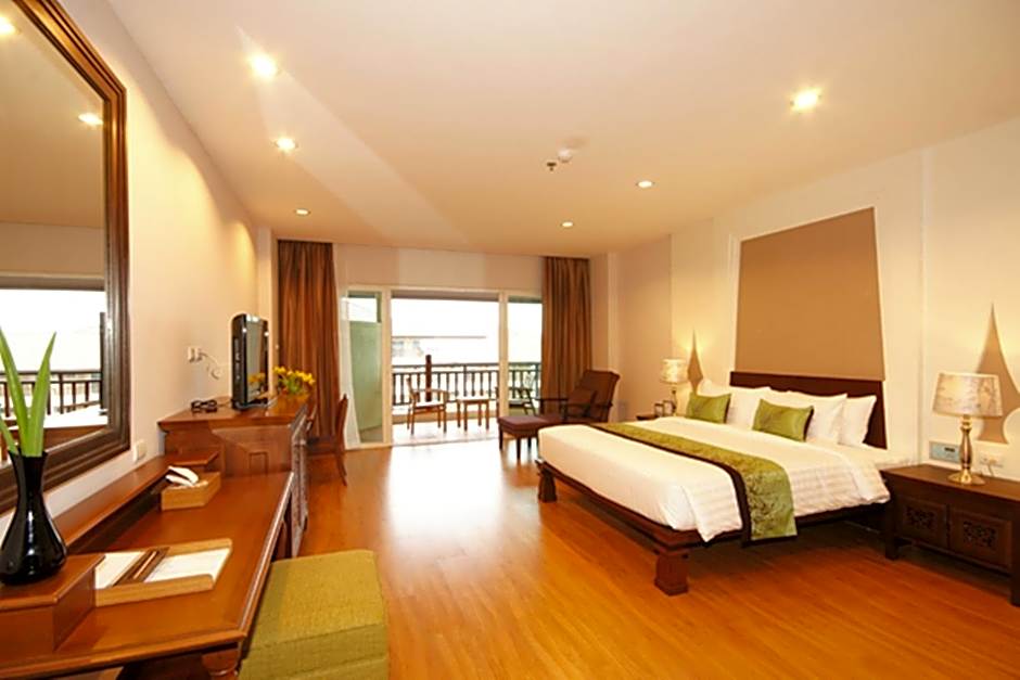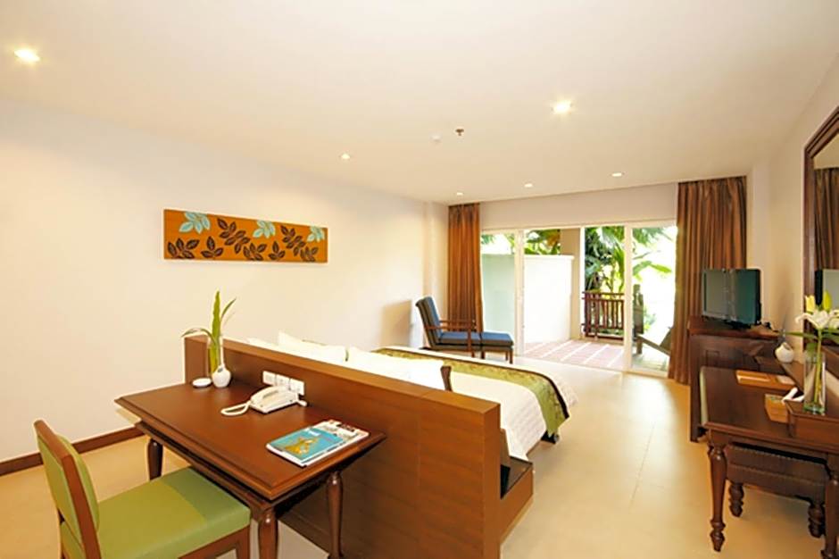 This spacious room features a private balcony with garden views. It has a flat-screen TV and DVD player.