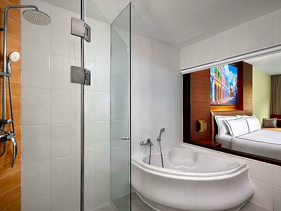 Spacious and cozy, this deluxe king room features a flat-screen cable smart TV with satellite channels, a safety deposit box and a mini refrigerator. Guests can enjoy views of the pool from the balcony. An private bathroom comes with a spa bath and a separated shower room.