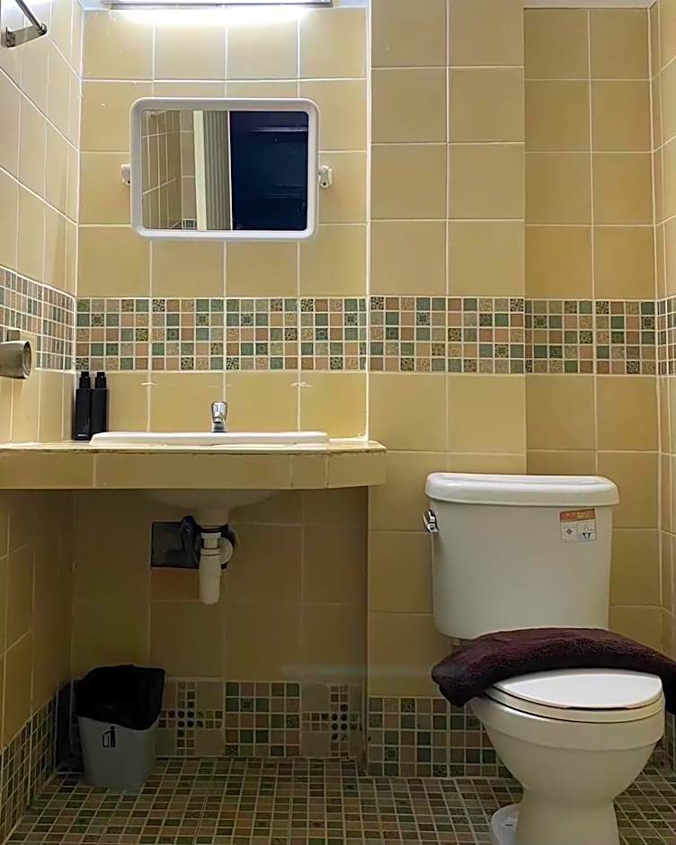 This double room has an private bathroom overlooking the pool area.