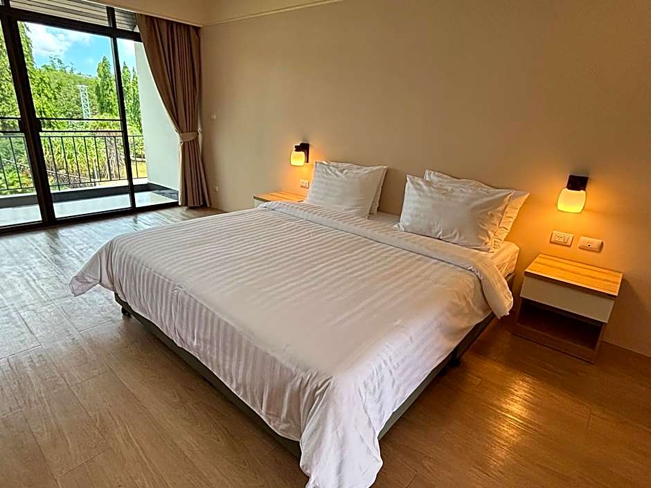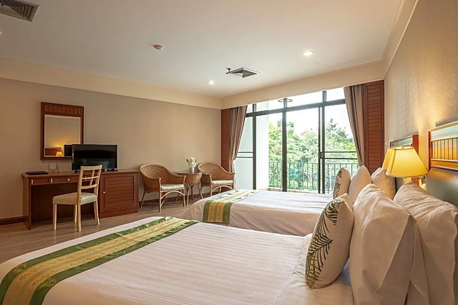 Accommodations range from Suite (646 sqft) to Deluxe (453 sqft) and Superior (377 sqft), all non-smoking and air-conditioned, with balconies or terraces that open onto garden views. Each room type offers a peaceful retreat complemented by garden-facing scenery and a touch of outdoor ambiance.