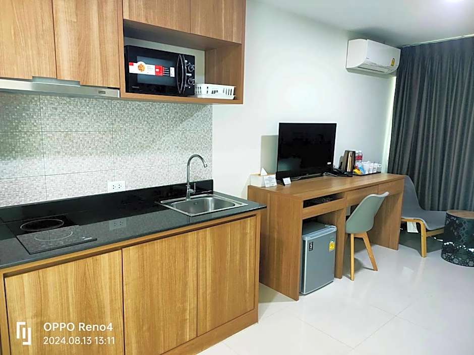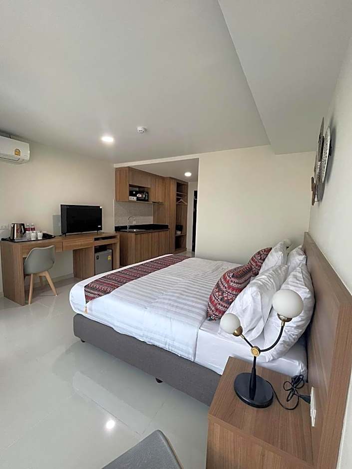 Beautiful pet friendly hotel in a quiet location but close to many necessary public offices, dentist, health centres. Great & reasonably priced masseur. Quiet, pool area & fitness room. Kind & helpful management & staff. Parking area, dog park, comfortable & clean reception area with small mini Market for essentials & ice-cream. I recommend this hotel 100% The only minus was no hot water in the kitchen so washing dishes and saucepans etc had to be done in the bathroom which wasn't easy or very hygienic. And just Thai TV with no way to use Netflix & no safe deposit box