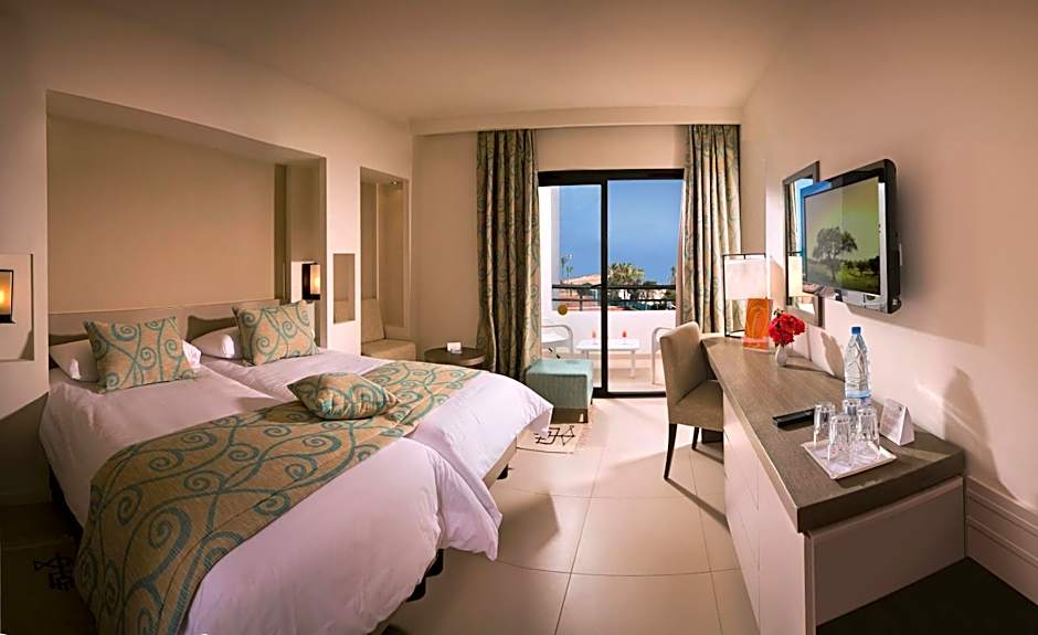 The hotel offers not only a serene setting and a wealth of amenities but also an array of delectable dining options. The on-site restaurant, Guellala, provides a modern and family-friendly ambiance, serving a mix of Mediterranean, pizza, local, and international cuisines. With a range of culinary delights, guests can savor a diverse selection of dishes without ever leaving the hotel grounds.
