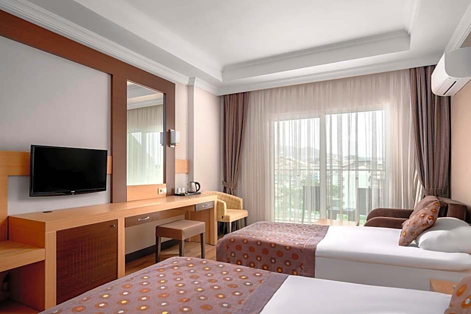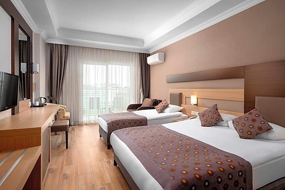 On-site highlights include a free water park, private beach area, and both indoor and outdoor swimming pools with a kids’ pool. A free kids' club, restaurant, bar, sun deck, terrace, and garden provide plenty of options, while free parking and a fitness center keep mornings simple. A variety of services carry extra charges, including Wi‑Fi, shuttle services, Turkish/steam bath, spa, water sports facilities, and other wellness offerings; live music performances are free to enjoy.