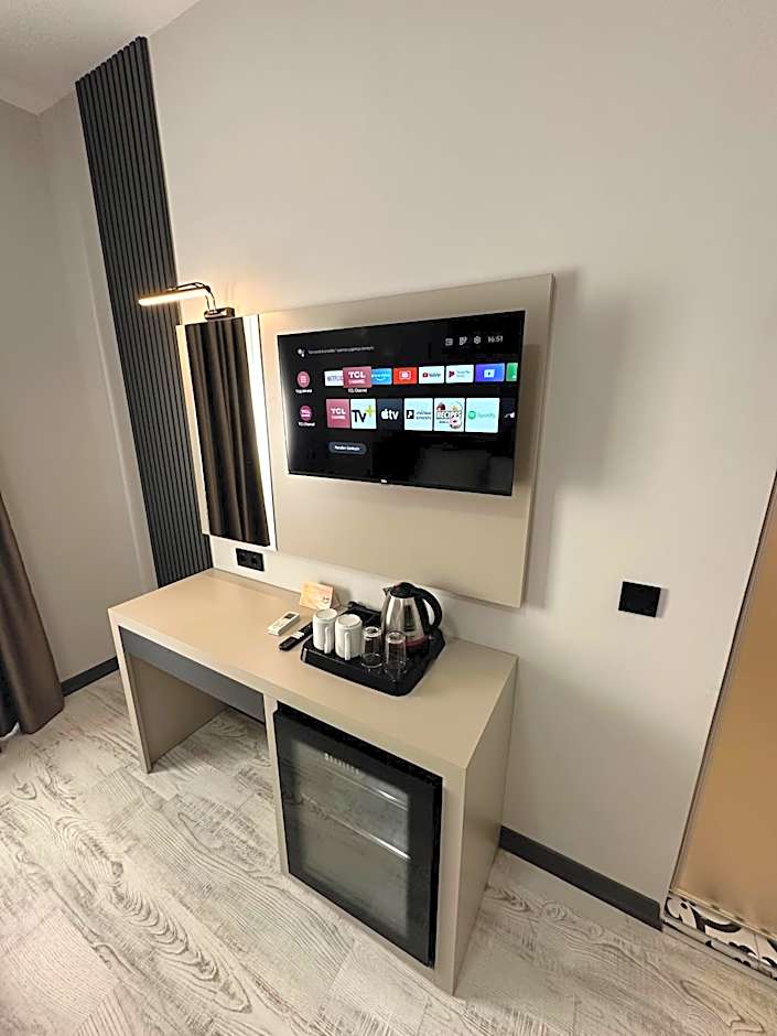We booked deluxe room but actually it’s just a normal room in my understanding. Clean and comfortable but some things in the room should be fixed. There ware torn curtain, broken bedside table and sink stand. I informed the receptionist but she just said ok. There were only Turkish channels but I won’t insist. Probably we didn’t find any English speaking channels. And one more thing. If you have elderly people traveling with you try to ask not the highest floor. Cos there is no elevator and it’s a bit of challenge to walk up for people who have problems with legs or heart problems. There were no toiletries only basic liquid soap, no water no tea or coffee bags. The blankets are very thin. But no complaints on anything cos we just slept in this room.