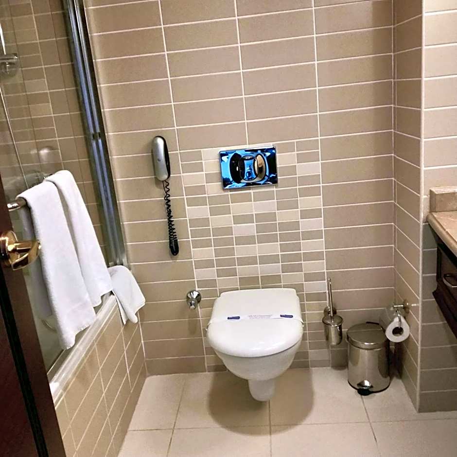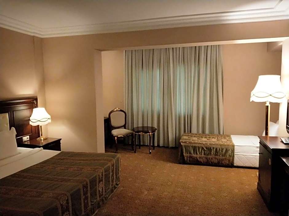 The style of this hotel is quite exceptional — it resembles an old-school queen-style hotel. We really enjoyed it, as it's not something you see every day. The room was large and spacious, with three beds. Even though it was located next to the street, it was very quiet inside. The bathroom was simple, with a shower. It could have been a bit cleaner, but for Turkey, it's acceptable. The breakfast offered a very good selection of food, and the restaurant was also quite spacious. The staff were very helpful. They use strollers for the bags, which makes transferring luggage from the car to the room super easy and fast. Also, it's only a 10-minute drive to Antalya Airport. If you're looking for a convenient place to stay near the airport, this is a great choice. There are also at least three gas stations right next to the hotel.
