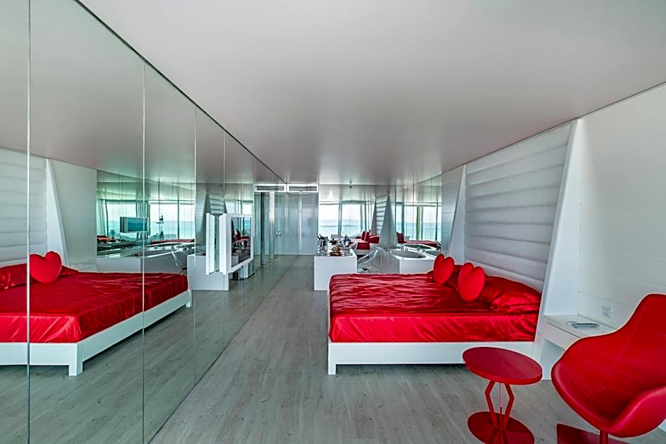 EVE is 2153 square feet and includes either a double bed 131-150 width or 2 single beds 80-130 width plus living room, balcony, and terrace.