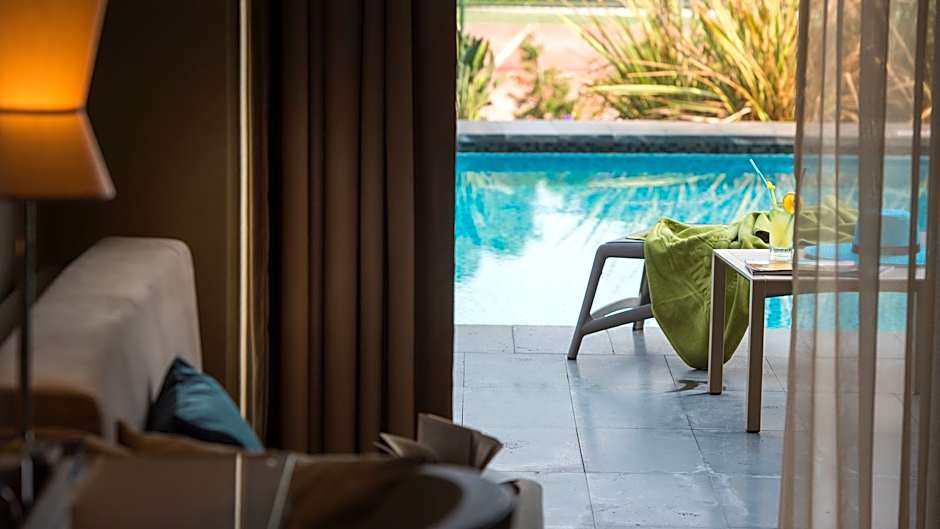 DELUXE SWIM UP POOL VIEW WITH TERRACE is 312 square feet and includes either a double bed 131-150 width or 2 single beds 80-130 width plus balcony and is Wheelchair-accessible.